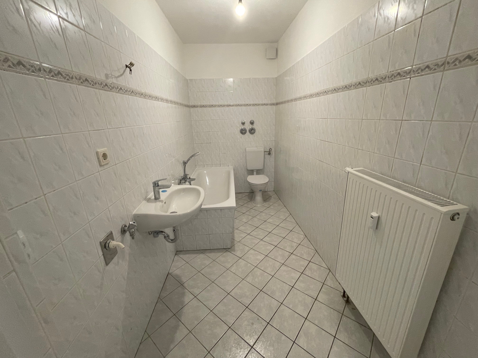 Das hell geflieste Badezimmer verfügt über ein Waschbecken, eine Badewanne sowie eine Toilette. Ein Waschmaschinenanschluss ist ebenfalls vorhanden.