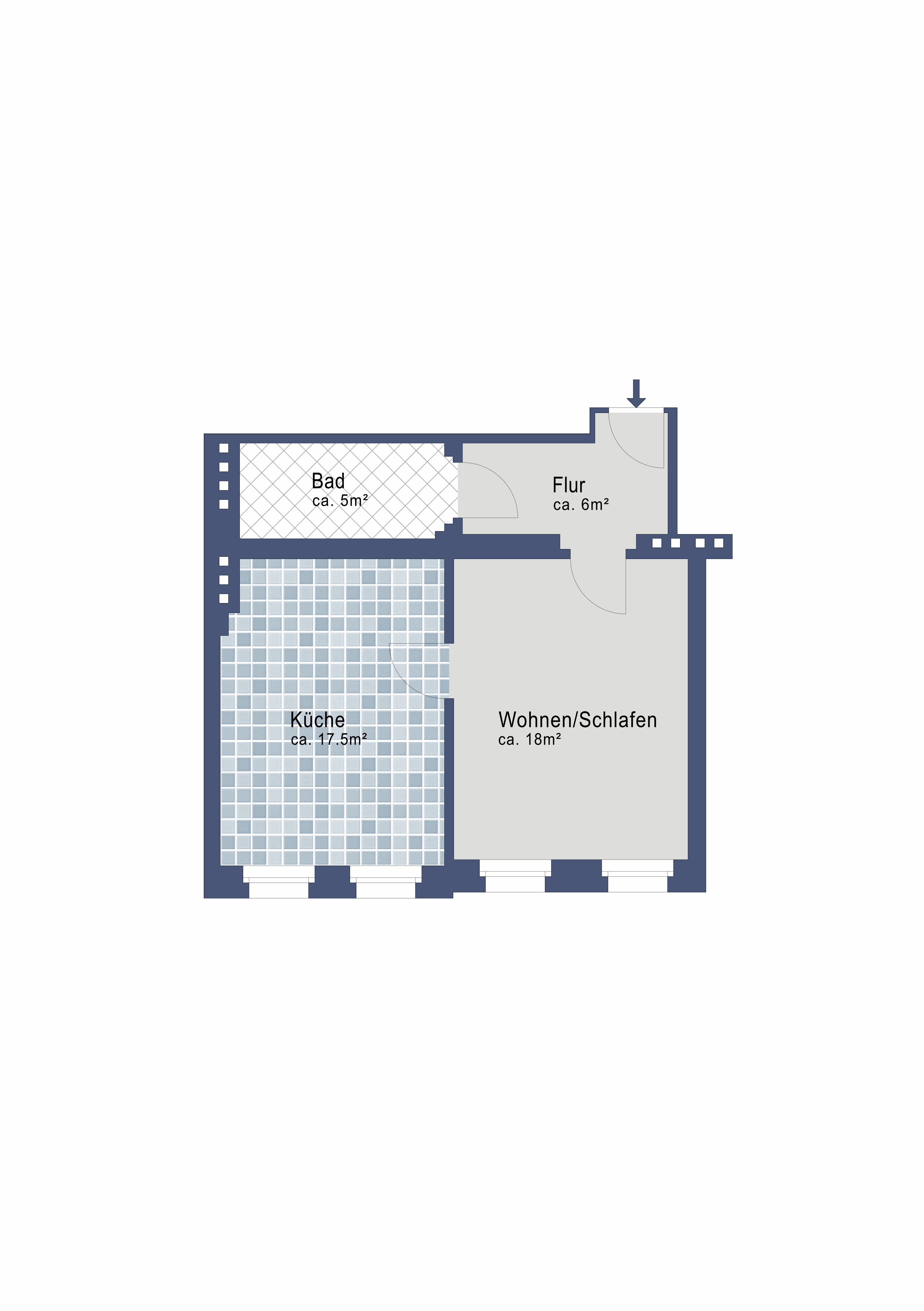 Die 1-Zimmerwohnung besteht aus einer großen Wohnküche sowie einem weiteren Zimmer, einem Badezimmer mit Badewanne und einem Flur.