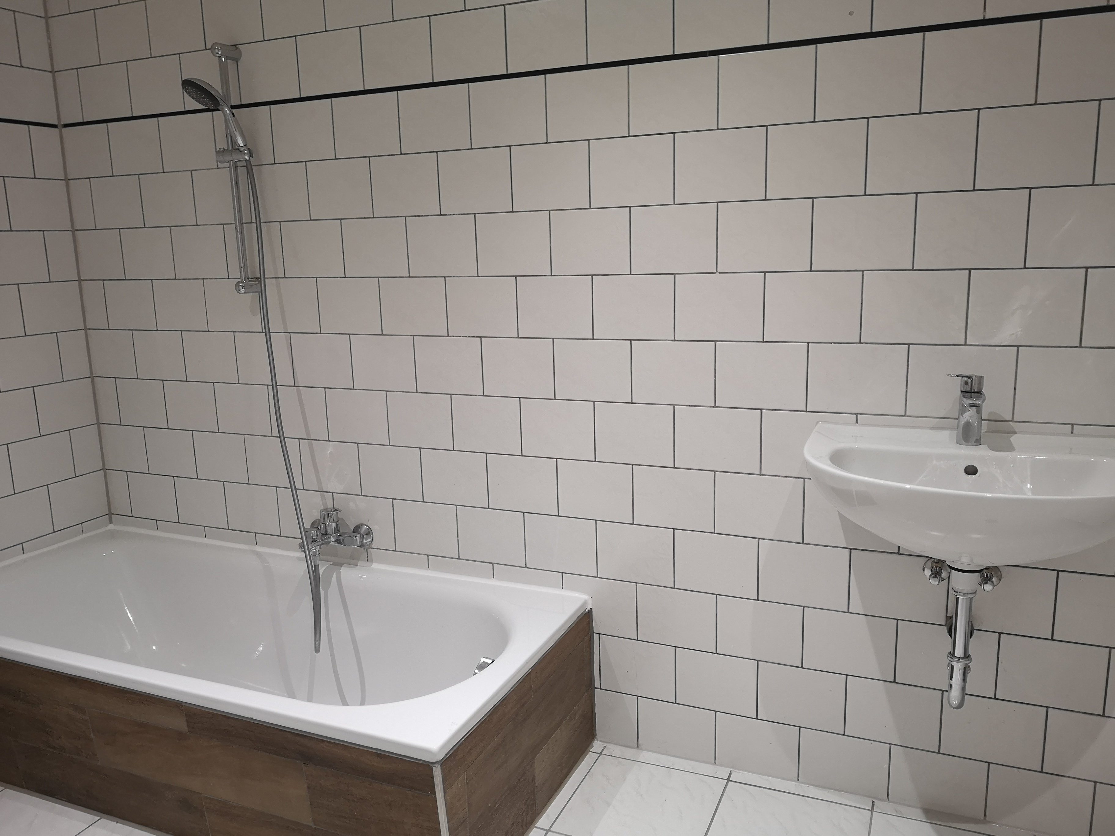 Dieses ist ausgestattet mit einem Waschbecken, einer Toilette sowie einer Badewanne. Ein Waschmaschinenanschluss ist ebenfalls vorhanden.