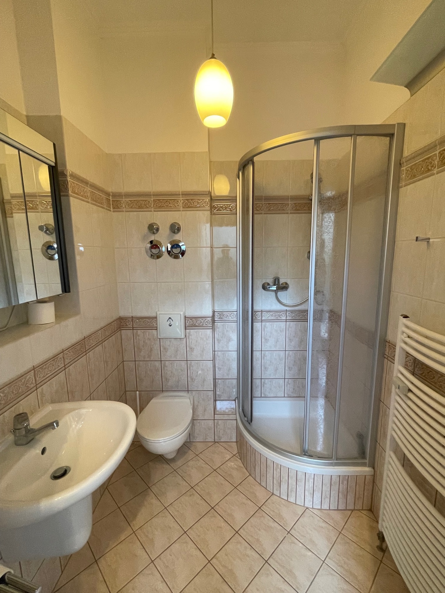 Das Badezimmer ist mit einer Dusche, einem Waschbecken sowie einer Toilette ausgestattet.