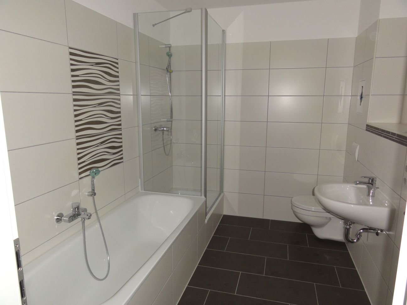 Das moderne Badezimmer ist ausgestattet mit einem Waschbecken, einer Dusche, einer Toilette sowie einer Badewanne.