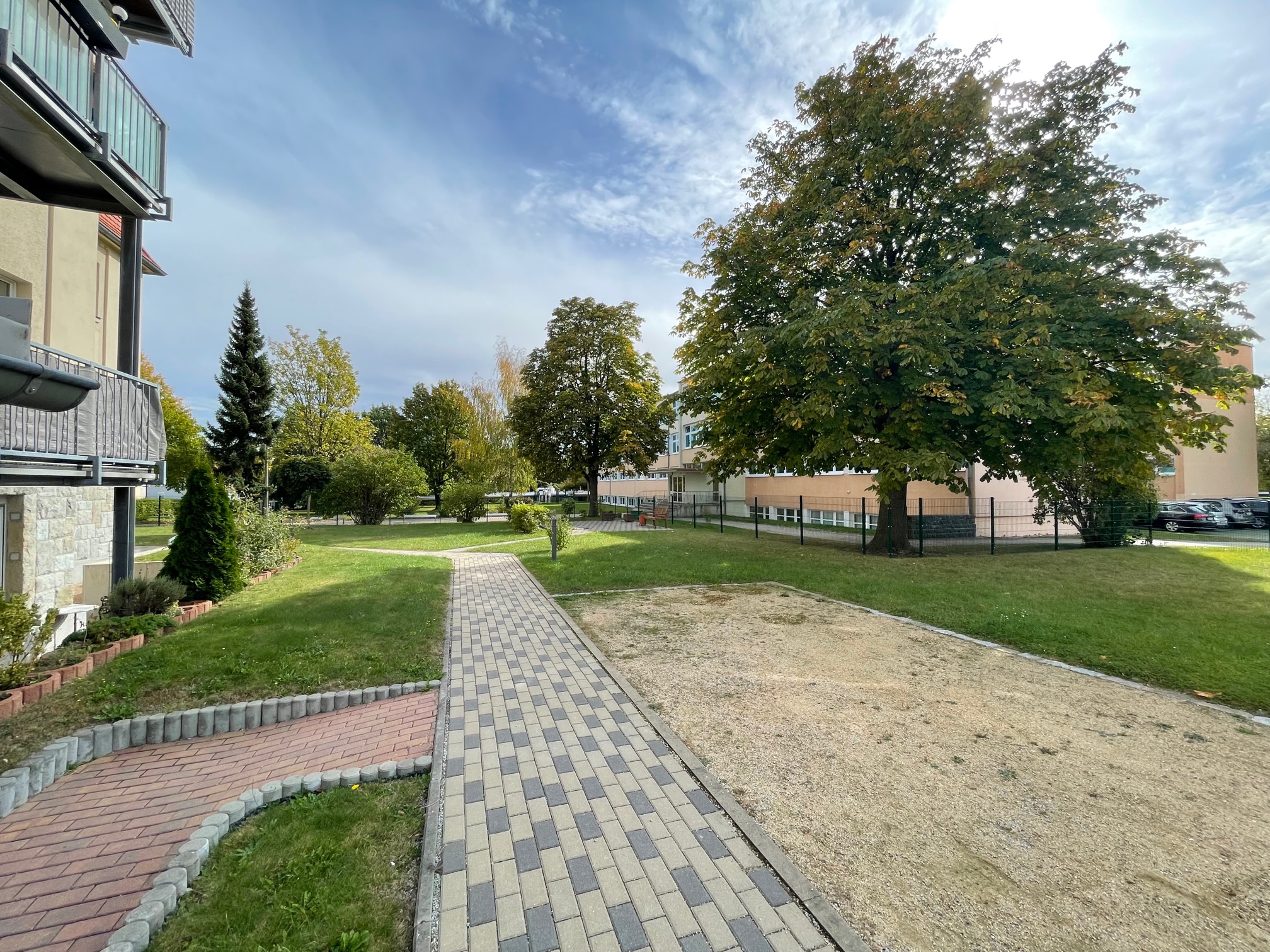 Vom Wohnzimmer aus gelangen sie auf den großen (ca. 16 qm) Balkon/Terrasse, der in Richtung des großen Gartens ausgerichtet ist.