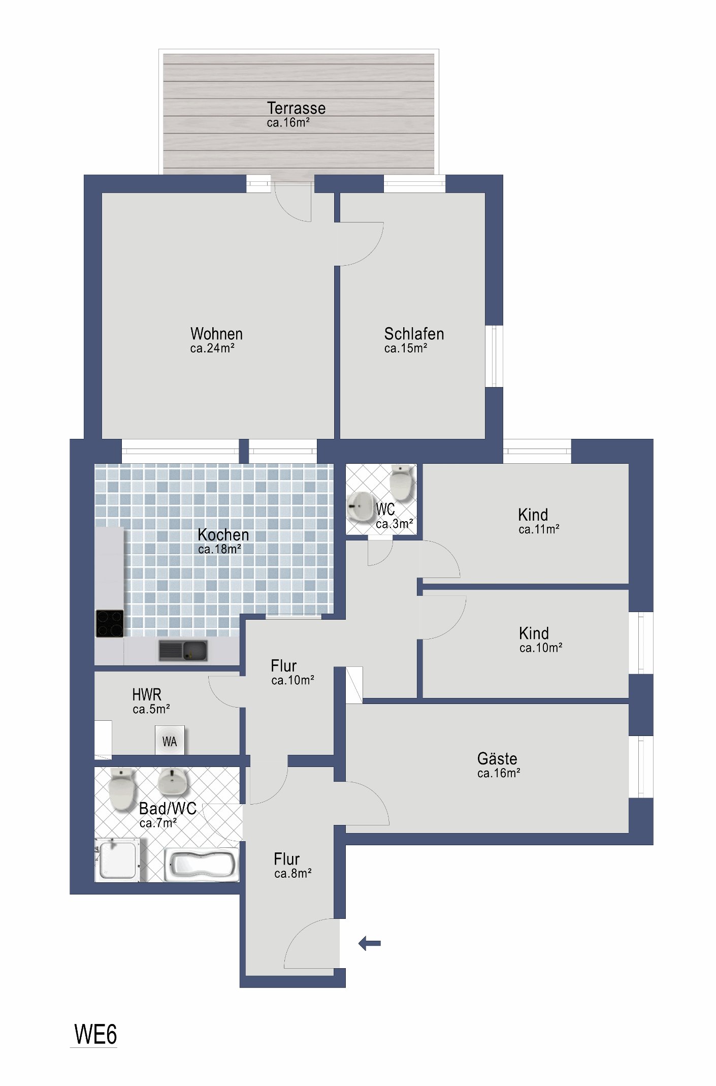 Als kommunikativer Mittelpunkt ist der große Wohn-Kochbereich mit fast 42qm zu erwähnen.