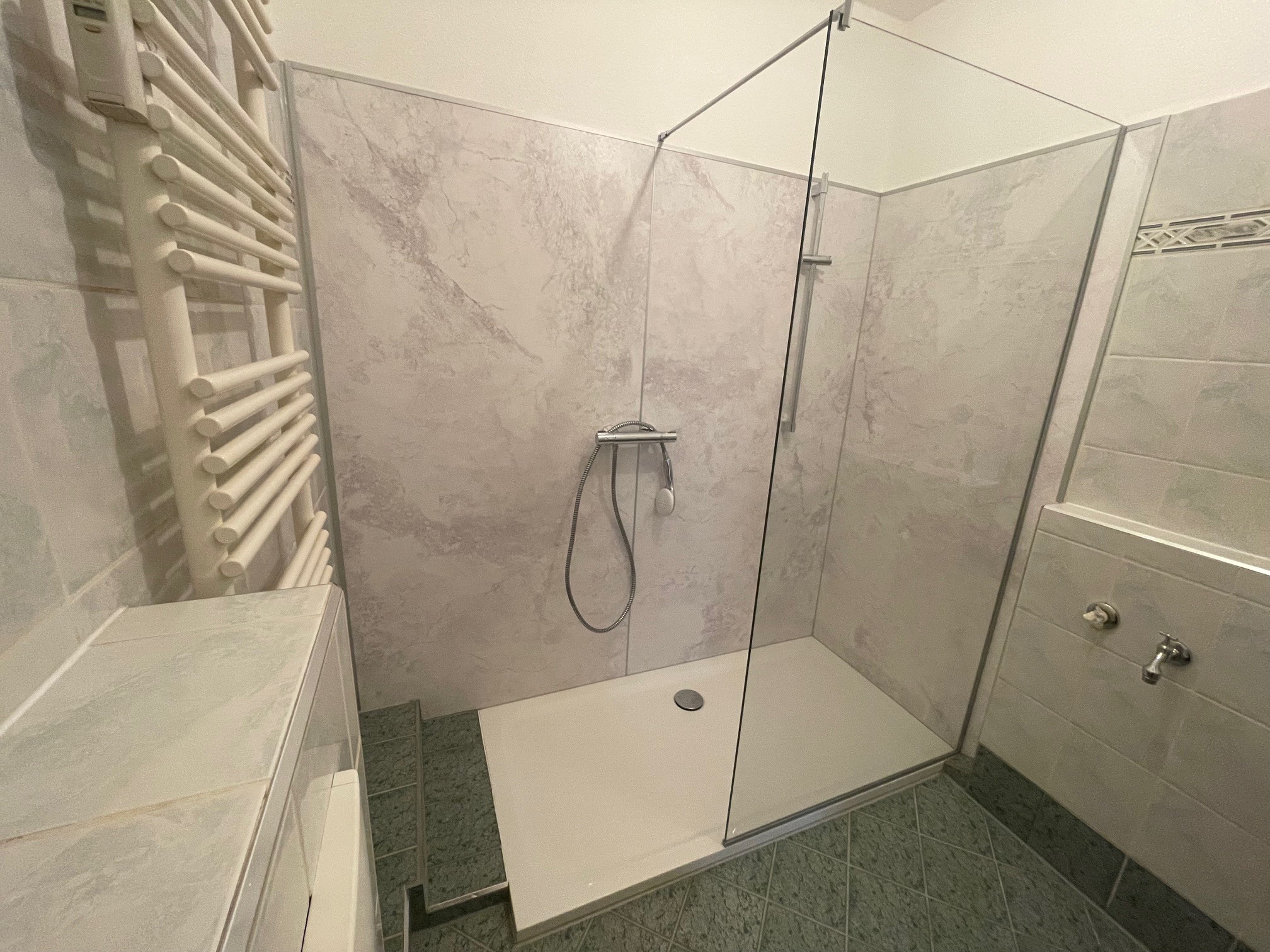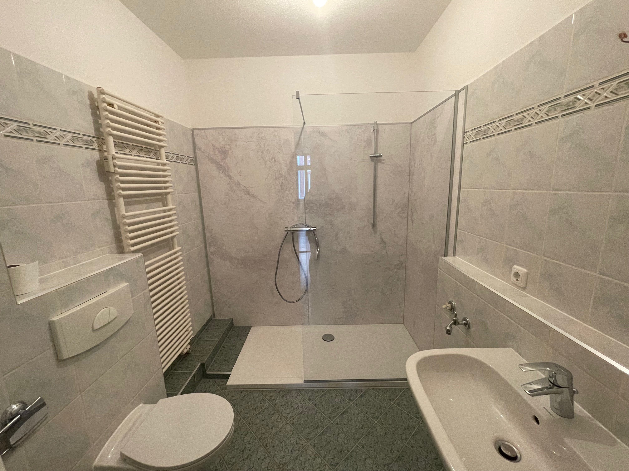 Im Zuge der Renovierung wurde die 3-Zimmerwohnung im Erdgeschoss mit einer bodengleichen Dusche ausgestattet.
